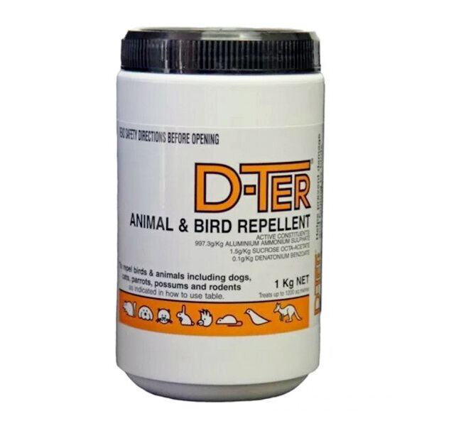 D-Ter Animal & Bird Repellent is a fantastic animal & bird repellent. Ideal for use as a repellent for dogs, cats, birds, possums, kangaroos, bandicoots and more! (Registered for use against all animals and birds).