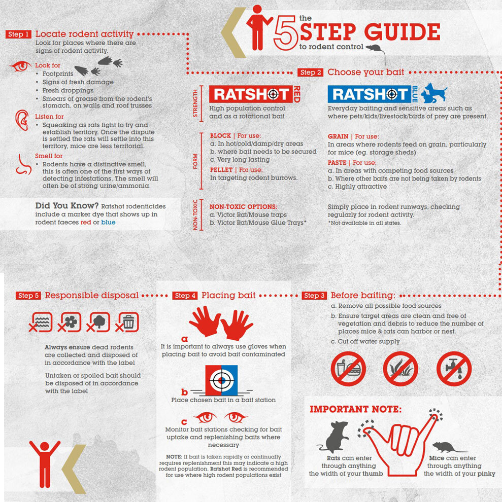 Dose Rates & Administration Instructions: For use in and around buildings, including industrial, commercial, agricultural, public services and domestic structures. It also reduces the risk for secondary poisoning for dogs, cats, birds, native animals, livestock. A 25g mouse will only require 0.4g bait to succumb to the effects whereas a 250g rat will only require 9.0g of bait.