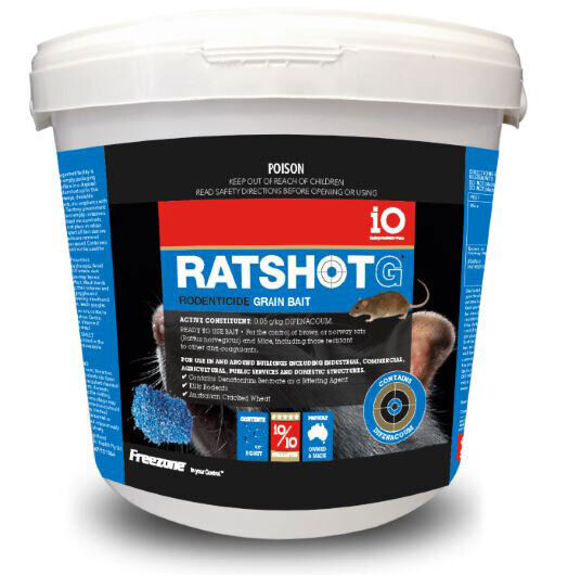 Controls & Prevents: iO Ratshot Grainbait is ready to use and deadly to Brown or Norway Rates and mice, including those resistant to other anti-coagulants.