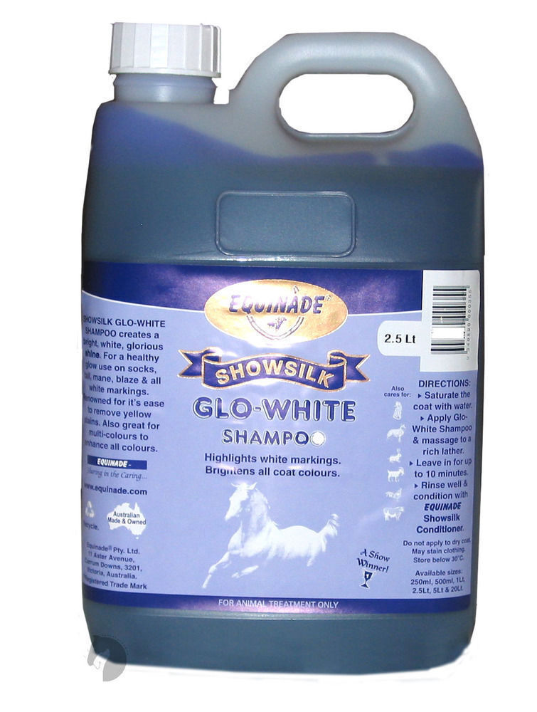 When using GLO-WHITE on an animal with white socks or blaze, protect the white markings with “Showsilk” Conditioner before shampooing.