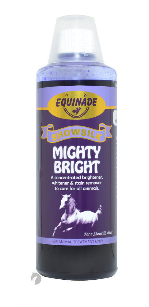 To use, first clean the animal using Equinade ShowSilk Shampoo, followed by Showsilk Conditioner.  Then simply mix at least 10ml of Equinade Showsilk Mighty Bright in 1lt of water. The required ratio will vary with each animal, so it is best to test a small area and if necessary, add 5ml increments of MIGHTY BRIGHT until the desired effect has been reached. Apply the remaining solution using a sponge. DO NOT RINSE