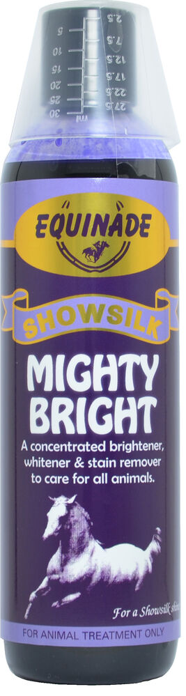 To use, first clean the animal using Equinade ShowSilk Shampoo, followed by Showsilk Conditioner.  Then simply mix at least 10ml of Equinade Showsilk Mighty Bright in 1lt of water. The required ratio will vary with each animal, so it is best to test a small area and if necessary, add 5ml increments of MIGHTY BRIGHT until the desired effect has been reached. Apply the remaining solution using a sponge. DO NOT RINSE