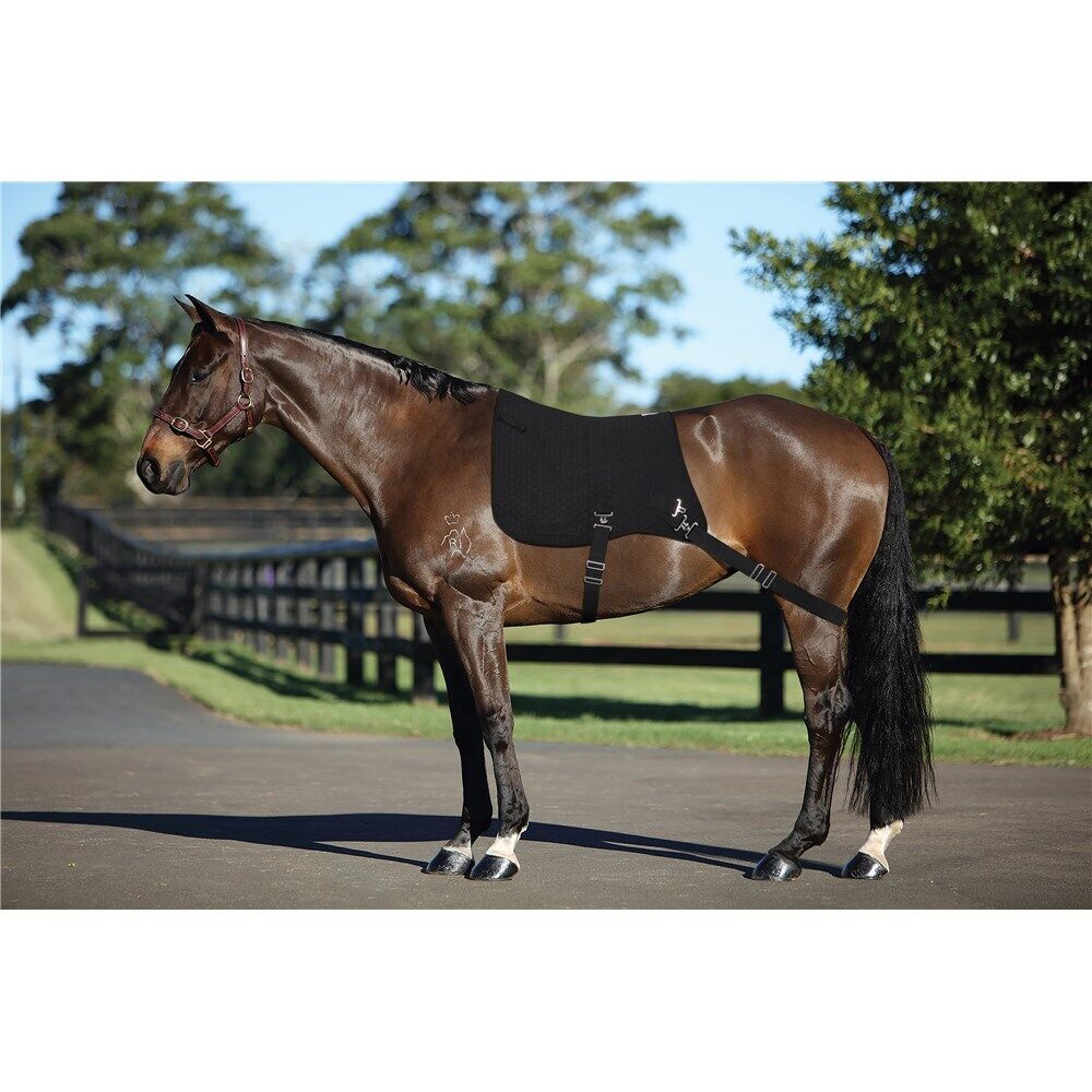 • An adjustable band wraps around the hindquarters, applying pressure and resistance to engage the abdominal muscles.