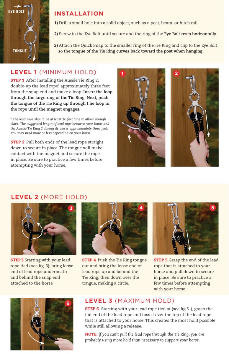 Designed to be a support system rather than a restraint system, the Tie Ring allows a horse to pull slack in the lead rope when he panics or falls. This releases pressure and the source of pain or panic, dramatically reducing the threat of injury to you and your horse.