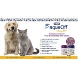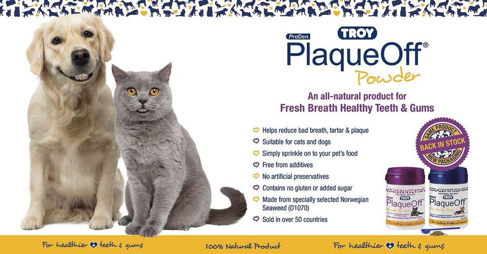 Troy PlaqueOff animal is an easy way for those dog and cat owners to care for their pet's teeth who don't have the patience or inclination to brush their dog or cat's teeth regularly. The product comes in powdered form and it is simply added on a daily basis to dry or wet food. Dogs and cats like the taste of the small amount that is added. Troy PlaqueOff animal does not rely on topical application or friction. The product is ingested and works systemically. The natural compound in the product comes out through the saliva and works to break down the bacterial biofilm that forms on the teeth and gums. This is how the natural bacteria in the mouth take hold onto the teeth and gums, colonizing and creating the oral problems of plaque and tartar, bad breathe and gingivitis. It does not change the Ph. of the mouth or kill off the normal levels of bacteria. Troy PlaqueOff has been proven to reduce plaque and tartar on the teeth and gums, depending on composition, diet and how long it has been there. It then works to prevent bad breath, plaque and tartar from returning. Patients generally begin to see results over a 2-8 week period, and will see further benefits with continued use. Troy PlaqueOff animal is made from a specific strain of selected seaweed harvested from above Scandinavia. This seaweed has developed a natural defensive mechanism against bacterial biofilm. The product is made only from this seaweed and has no additives or chemicals added. It is human grade and human tested.