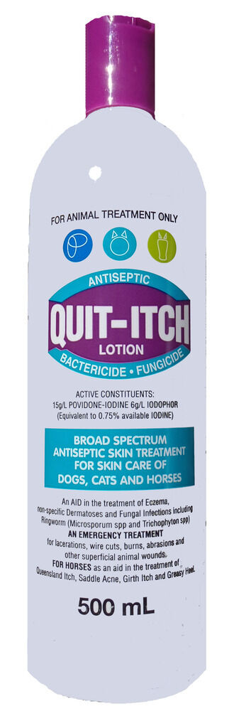 Quit-Itch Lotion is a broad-spectrum antiseptic skin treatment for skin care of dogs, cats and horses.