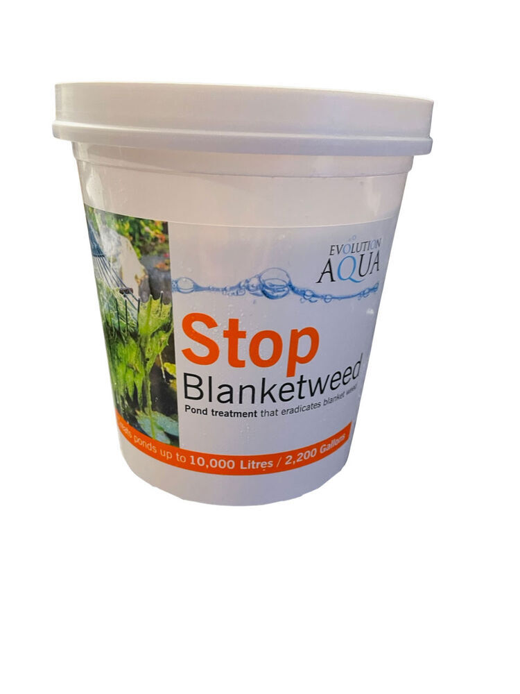 STOP Blanketweed is an effective treatment of filamentous algae, commonly known as blanket weed in ornamental and garden ponds. Blanket weed is one of the most hated problems of pond keeping and a nuisance to everyone as it makes your pond unsightly, blocks filters, pumps and pipes. STOP Blanketweed is a unique product which will successfully eradicate blanket weed when used as instructed. 1kg (Treats up to 10,000 litres / 2,200 Gallons) Dosage Instructions Apply 30 grams (one scoop) of powder per 900 litres / 198 gallons of water. Mix the powder thoroughly with pond water in a suitable clean container. Now distribute this mixture evenly over the pond surface. Add this dose once per week until the blanket weed has gone, usually after 3 weeks. One or two additional doses may be needed in some ponds. Continue to dose once a month to prevent the blanket weed returning. If water temperature is below 8°C, treatment efficiency is reduced. Pond size in litres Pond size in gallons Dosage in grams 2 – 4 weekly doses to eradicate blanketweed 900 198 30grm One Scoop 1800 396 60grm Two Scoops 2700 594 90grm Three Scoops 3600 792 120grm Four Scoops 4500 990 150grm Five Scoops 9000 1980 300grm Ten Scoops FAQ: Is Stop Blanketweed safe to use with all pond fish? Stop Blanketweed safe to use with all ornamental pond fish. Is Stop Blanketweed safe to use with wildlife? We recommend Stop Blanketweed is not used when frogs and newts are spawning. Will Stop Blanketweed turn my water cloudy? Stop Blanketweed may occasionally turn pond water white and cloudy for a few days, but water will clear. Do I need a pond filter for Stop Blanketweed to work? Evolution Aqua Stop Blanketweed is most effective in ponds with moving water, from a pump, filter, fountain or waterfall, and strong surface agitation, or aeration from an airpump and airstone is recommended. Should I switch my Ultra Violet Clarfier Off when using Stop Blanketweed? UV clarifiers do not need to be turned off when using Evolution Aqua Stop Blanketweed How often should I use Stop Blanketweed? Dose the recommended amount of Stop Blanketweed once a week for four weeks, dose monthly after the initial application to maintain clear water. Will water temperature effect the performance of Stop Blanketweed? If water temperature is below 8°, treatment efficiency is reduced. Stop Blanketweed will be more effective as temperatures rise. Is Stop Blanketweed safe to use in planted ponds? Stop Blanketweed is safe to use in planted ponds, and should have no effect on the plants. Will Stop Blanketweed eradicate pond moss? No, it will not eradicate pond moss. I treated my pond with Stop Blanketweed but I now need to treat my fish with a medication. How long should I wait before I use another chemical? Our advice is to leave it 7 days after using one treatment before you use another treatment. And also carry out a partial water change if needed, if the medication may react with the first. Please note, in the case of the Stop Blanketweed, for this treatment to be at its most effective the advice