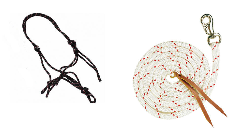 • Knotted rope halter made from a continuous length of braided climber's rope