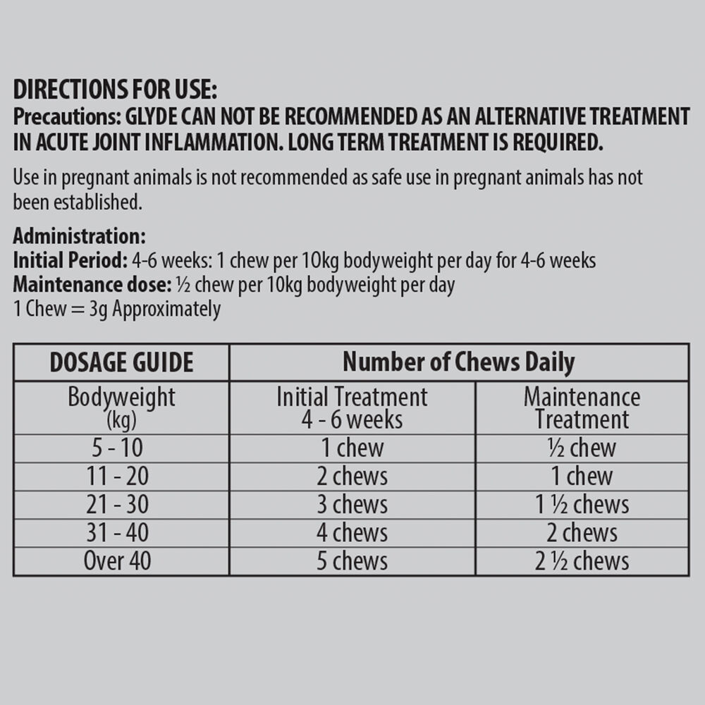 Glyde Mobility Chews for Dogs uses all-natural ingredients to promote healthy joints that let your dog do everything he or she loves to do! Glyde is the only APVMA registered nutraceutical that contains proven level of three key components that work to relieve the painful signs of arthritis.